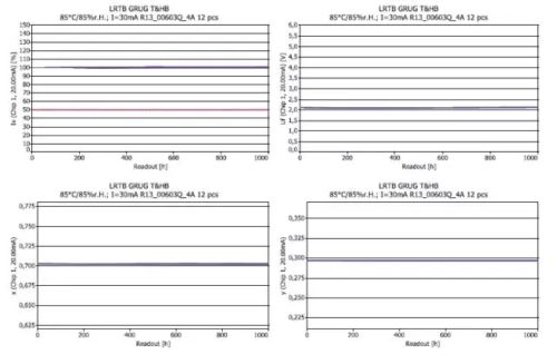 歐司朗光電半導(dǎo)體所有led顯示屏應(yīng)用的LED產(chǎn)品,都能提供詳盡的可靠性測(cè)試報(bào)告。報(bào)告內(nèi)容不只是提供“死燈”率,而是通過(guò)在每項(xiàng)測(cè)試中LED關(guān)鍵規(guī)格隨時(shí)間變化的曲線(如圖十所示,產(chǎn)品LRTB GRUG在高溫高濕1000小時(shí)的測(cè)試中,亮度、電壓和色點(diǎn)隨時(shí)間的變化曲線)。