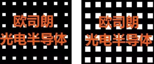 在觀測(cè)距離足夠大的情況下,LED發(fā)光面在總個(gè)顯示面積中的占據(jù)比例將會(huì)影響屏幕的對(duì)比度。由于LED與LED之間的空間會(huì)由面罩占據(jù),而即使是最黑的LED,表明反光率也會(huì)比面罩高,所以,LED發(fā)光面在總個(gè)顯示面積中的占據(jù)比例越高,屏幕的對(duì)比度就越低。圖八為相同點(diǎn)間距、不同LED尺寸的顯示示意對(duì)比。