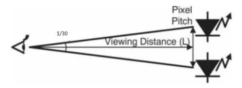 當(dāng)觀測(cè)距離(L)是10米時(shí),點(diǎn)間距的極限(Dpp)就是5.8mm。更高的像素密度將是沒(méi)有意義的。