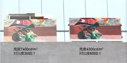 根據(jù)行業(yè)標(biāo)準(zhǔn)SJ/T11281-2007《發(fā)光二極管(LED)顯示屏測(cè)試方法》的定義,顯示屏在一定的環(huán)境照度下,其最大亮度與背景亮度之比稱為最高對(duì)比度(具體測(cè)試條件和方法見(jiàn)該標(biāo)準(zhǔn))。例如一個(gè)屏幕在全白屏狀態(tài)時(shí)候亮度為5000cd/m2,全黑屏狀態(tài)亮度為1cd/m2,這樣屏幕的對(duì)比度就是4999:1。對(duì)比度的定義其實(shí)強(qiáng)調(diào)了在使用環(huán)境中,顯示畫面的可辨識(shí)程度,相對(duì)于亮度指標(biāo),對(duì)比度指標(biāo)增加對(duì)全黑屏狀態(tài)下的亮度考察,而全黑屏狀態(tài)下的亮度又與環(huán)境光和屏幕本體(LED和面罩)的反光屬性密切相關(guān)。以下戶外的對(duì)比實(shí)例可以看出,亮度高而對(duì)比度低的屏幕反而沒(méi)有亮度相對(duì)低而對(duì)比度高的屏幕效果好。
