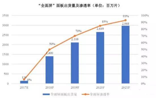 全球市場對(duì)“全面屏”的接受程度越來越高,“全面屏”手機(jī)的開發(fā)節(jié)奏將會(huì)持續(xù)加快并迎來銷售高峰。據(jù)CINNO Research的數(shù)據(jù)顯示,2017年“全面屏”在高端智能機(jī)市場的滲透率為6%,2018年會(huì)飆升至50%,2021年將會(huì)達(dá)到93%。從智能機(jī)面板的維度來看,2017年全球“全面屏”面板的總出貨量預(yù)計(jì)為1.39億塊;2018年全球“全面屏”面板的總出貨量增長至14億塊;2021年幾乎所有的用于智能機(jī)的面板都會(huì)轉(zhuǎn)向“全面屏”方案,預(yù)計(jì)總量將達(dá)到29.68億塊。