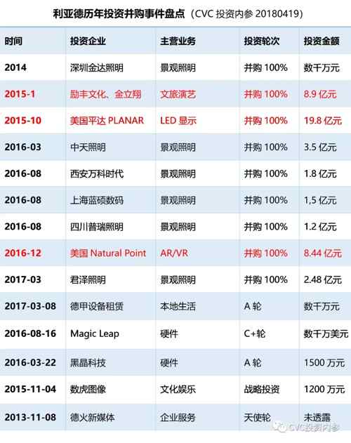 2015年北京利亞德投資有限公司成立,主要運(yùn)營戰(zhàn)略投資、產(chǎn)業(yè)投資基金/風(fēng)險(xiǎn)投資基金、資本運(yùn)營、證券投資等金融服務(wù)。利亞德也成功通過并購,從單一的LED顯示業(yè)務(wù),擴(kuò)展到顯示、景觀照明、文旅新業(yè)態(tài)及VR體驗(yàn)多個(gè)領(lǐng)域,業(yè)務(wù)結(jié)構(gòu)趨于多元化,并且也沒有太大的跨界,而是基于公司主業(yè)的縱深拓展。