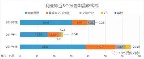 2017年,公司取得了不俗的業(yè)績,LED顯示產(chǎn)品居全球LED影像顯示屏市場的市占率第一,擁有14%的市場份額;LED城市景觀亮化業(yè)務(wù)規(guī)模全國第一;智能顯示仍為公司主要業(yè)務(wù)支撐,占比60%,毛利率保持在37%;夜游經(jīng)濟(jì)增速接近100%,毛利率保持在40%以上;文旅新業(yè)態(tài)增速均衡超40%,毛利率保持在40%;VR體驗(yàn)是2017年新增業(yè)務(wù),屬于高科技產(chǎn)品,毛利率近80%。