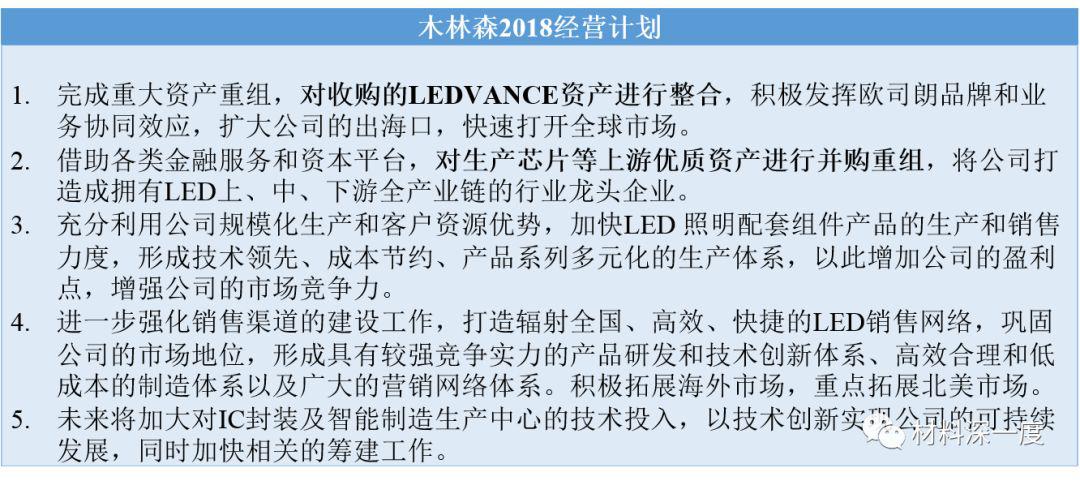 2018年,公司將繼續(xù)立足主業(yè)、持續(xù)創(chuàng)新,加大產(chǎn)品研究開(kāi)發(fā)力度;完成公司的并購(gòu)重組業(yè)務(wù),推動(dòng)國(guó)內(nèi)外市場(chǎng)業(yè)務(wù)的聯(lián)動(dòng)發(fā)展,并借助各類(lèi)金融服務(wù)和資本平臺(tái),把握行業(yè)發(fā)展機(jī)遇,將木林森打造成為集LED芯片生產(chǎn)、封裝及應(yīng)用照明產(chǎn)品為一體的具有國(guó)際競(jìng)爭(zhēng)力的LED生產(chǎn)企業(yè)。