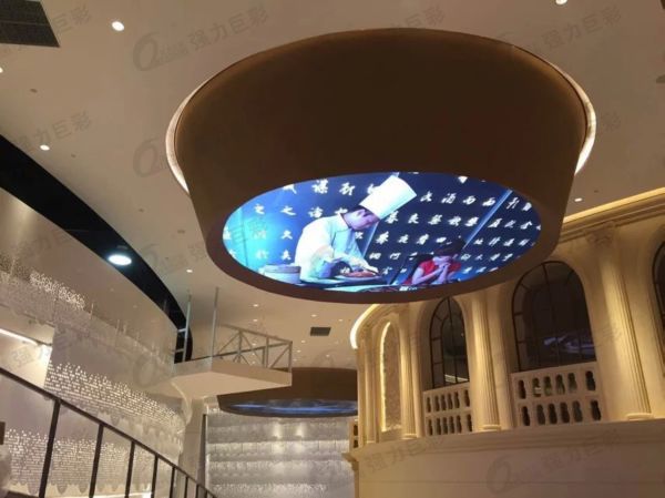 在酒店大堂,強(qiáng)力巨彩室內(nèi)全彩大屏環(huán)形吊裝,快速提升酒店格調(diào)