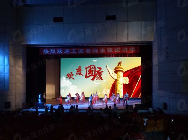 在學(xué)校禮堂,強(qiáng)力巨彩室內(nèi)全彩大屏靈活切換絢麗背景,傾力助陣學(xué)生生動(dòng)演繹
