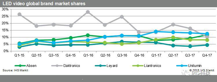 從各大品牌在LED顯示產品市場份額來看,盡管在過去幾年達科一直占據著市場份額首位,但是從2017年第四季度來看,國內的四大品牌不斷發(fā)力,大有后來而居上的勢頭。究其根本原因,在于達科的成熟的小間距產品在2017推出,這個時間遠遠晚于其他競爭者。在國內小間距產品市場,中國品牌出貨目前遠超海外品牌。
