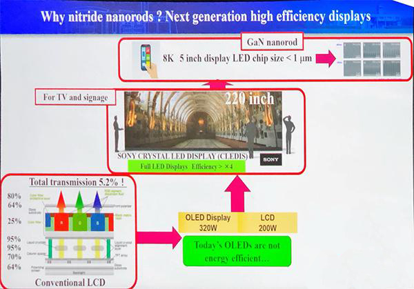 天野浩教授本次分享的內(nèi)容除了未來LED在各種節(jié)能領(lǐng)域的應(yīng)用前景之外,針對(duì)顯示器領(lǐng)域,也特別探討了Nanorods LED,認(rèn)為該技術(shù)未來將有機(jī)會(huì)成為顯示器領(lǐng)域當(dāng)中的可能選項(xiàng)之一。尤其是當(dāng)未來消費(fèi)性電子產(chǎn)品的顯示器分辨率需要拉高到8K的時(shí)候,Micro LED芯片尺寸則需要小于1µm,才能夠符合手機(jī)熒幕大小,無論是用QD或是熒光粉,想要在這么小的芯片上面去涂布這些材料去作光色轉(zhuǎn)換都會(huì)面臨到相當(dāng)大的技術(shù)障礙。