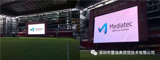 受TV2和Telia Parken的委托,由Mediatec提供LED面板,總面積264平方米,搭建成一個(gè)22m x 12m的超級(jí)大屏幕,據(jù)說(shuō)這也是歐洲最大的屏幕之一。丹麥和秘魯?shù)倪@場(chǎng)比賽全程都在4K超高清的屏幕上顯示,數(shù)萬(wàn)球迷的目光都聚集在這個(gè)塊顯示屏上。