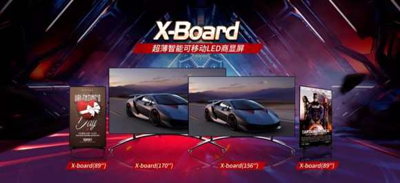 X-Board系列——超薄智能可移動(dòng)LED商用顯示屏,具備89寸,156寸,170寸,240寸四種尺寸,具備超輕超薄可移動(dòng)(厚35mm)、用戶級(jí)前維護(hù)及智能管理等特點(diǎn)。除此之外, 89寸移動(dòng)大屏更具備可觸屏,可旋轉(zhuǎn)等功能,值得您的期待。