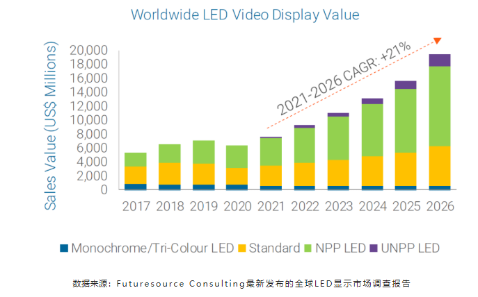 全球LED顯示行業(yè)正走出新冠疫情的陰霾,于2021開始全面復(fù)蘇。Futuresource報(bào)告顯示,2021年全球LED顯示市場(chǎng)總額達(dá)到76億美元,較2020年同比增長(zhǎng)19%。預(yù)計(jì)2022年全球LED市場(chǎng)規(guī)模將達(dá)到94億美元,或同比增長(zhǎng)22%。Futuresource預(yù)測(cè),到2026年,該市場(chǎng)規(guī)模將達(dá)到195億美元,2021至2026年間的復(fù)合年增長(zhǎng)率達(dá)21%。