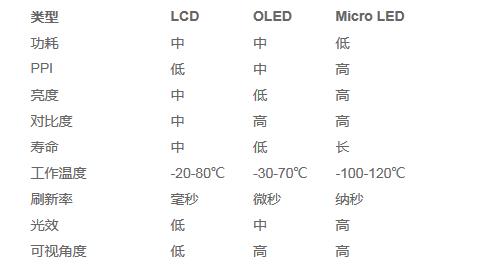 Micro LED顯示技術(shù),在對(duì)比度、能耗、響應(yīng)時(shí)間等功能表現(xiàn)上均優(yōu)于LCD和OLED(參考表1)。整體來(lái)看, Micro LED不但厚度比LCD、OLED更薄,與同為自發(fā)光的OLED比較, Micro LED具有較佳的發(fā)光能效、更高的解析度、工作溫度范圍更廣、產(chǎn)品壽命更長(zhǎng)等優(yōu)勢(shì),因此Micro LED被視為新一代顯示技術(shù),應(yīng)用領(lǐng)域聚焦公共信息顯示、TV、車(chē)載顯示、穿戴設(shè)備等終端顯示。