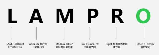 以“青出于藍”為主題,藍普由LAMP轉(zhuǎn)變?yōu)長AMPRO。據(jù)藍普總經(jīng)理王德奎介紹,藍普從LAMP到LAMPRO,只增加了兩個字符“RO”,但卻帶來了更深刻的含義!盤RO“第一層寓意“professional (專業(yè)性)”——藍普提供專業(yè)的產(chǎn)品及解決方案,第二層寓意是“pro for partners”,藍普將專注于服務(wù)合作伙伴,實現(xiàn)互利共贏。此外,“O”是對原有藍色盾牌的延續(xù),綠色代表著高清、節(jié)能、環(huán)保的產(chǎn)品定位,更具活力,更國際化的品牌形象和精神內(nèi)涵,以及業(yè)務(wù)的全新升級。