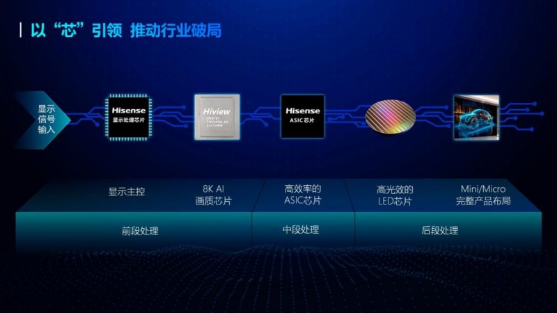 在傳統(tǒng)LED顯示行業(yè)中,顯示控制卡、驅(qū)動芯片、顯示屏各環(huán)節(jié),不同廠家分工明確,雖然可以使行業(yè)分工效率最大化,但隨著用戶對于超高清顯示畫質(zhì)的需求,對于智能化的需求越來越高,分段式的行業(yè)分工不可避免地遇到了瓶頸。作為顯示行業(yè)的“領(lǐng)頭羊”,海信從一開始便有意識的進(jìn)行布局,打通產(chǎn)業(yè)鏈上的斷點,讓技術(shù)創(chuàng)新真正能夠傳遞到終端用戶,給用戶帶來價值,打造了以高畫質(zhì)、高性能、高標(biāo)準(zhǔn)、高質(zhì)量、高體驗這“五高”為核心競爭力的新一代獵影顯示技術(shù)平臺。